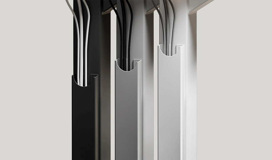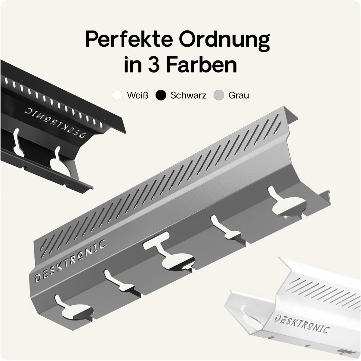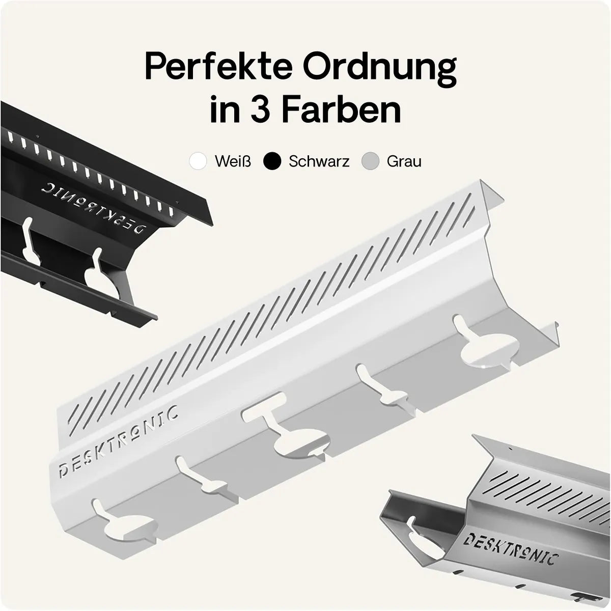 Kabelkanäle sind in denselben Farben erhältlich wie unsere Gestelle für höhenverstellbare Schreibtische, nämlich: Schwarz (RAL9005), Weiß (RAL9016) und Grau (RAL9006), um eine perfekte Farbübereinstimmung zu gewährleisten.