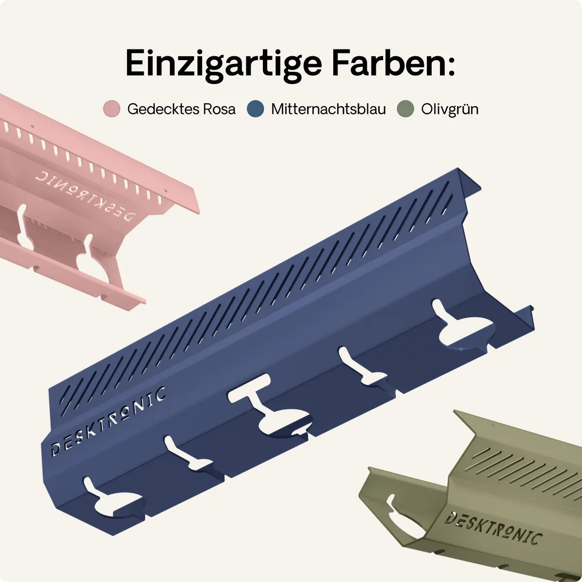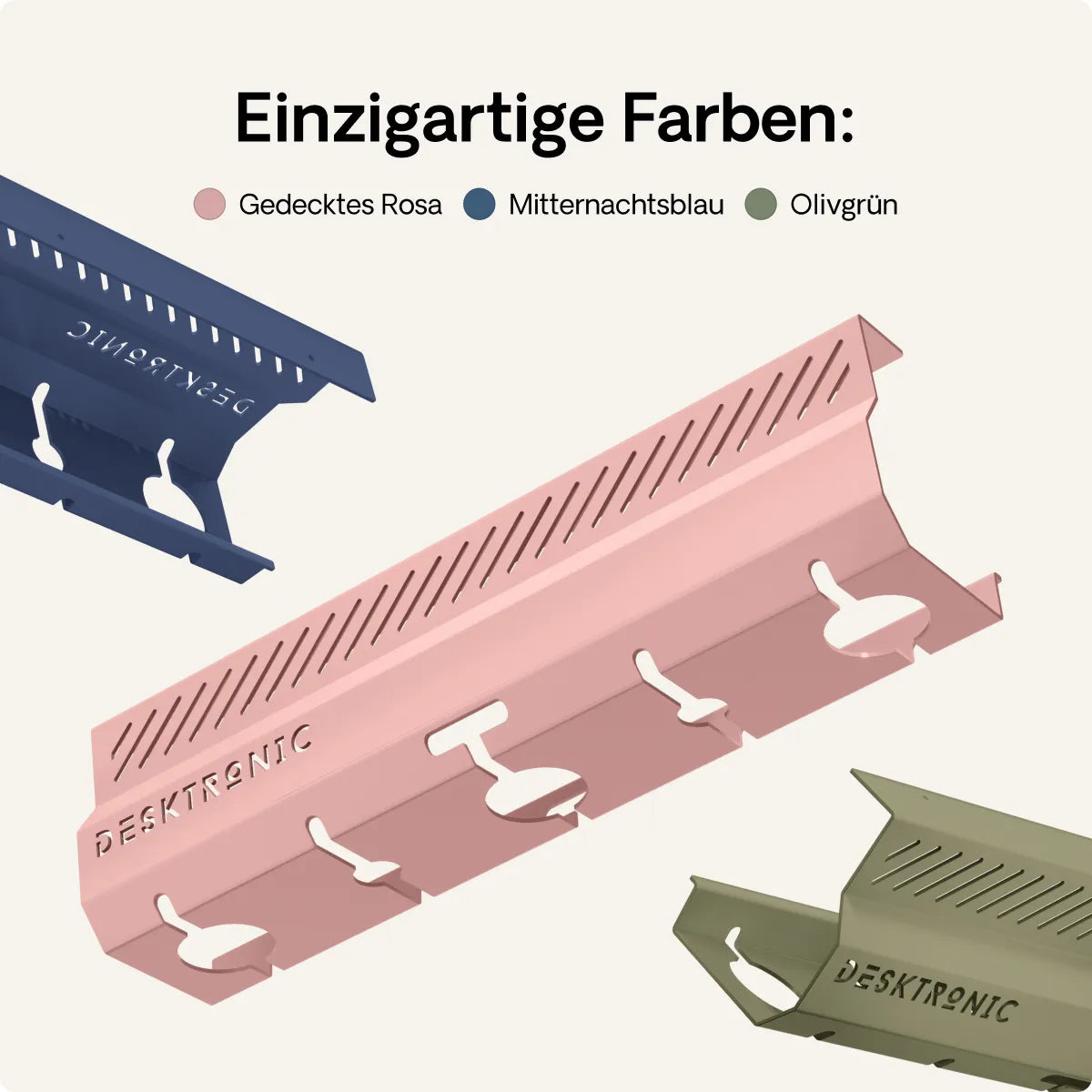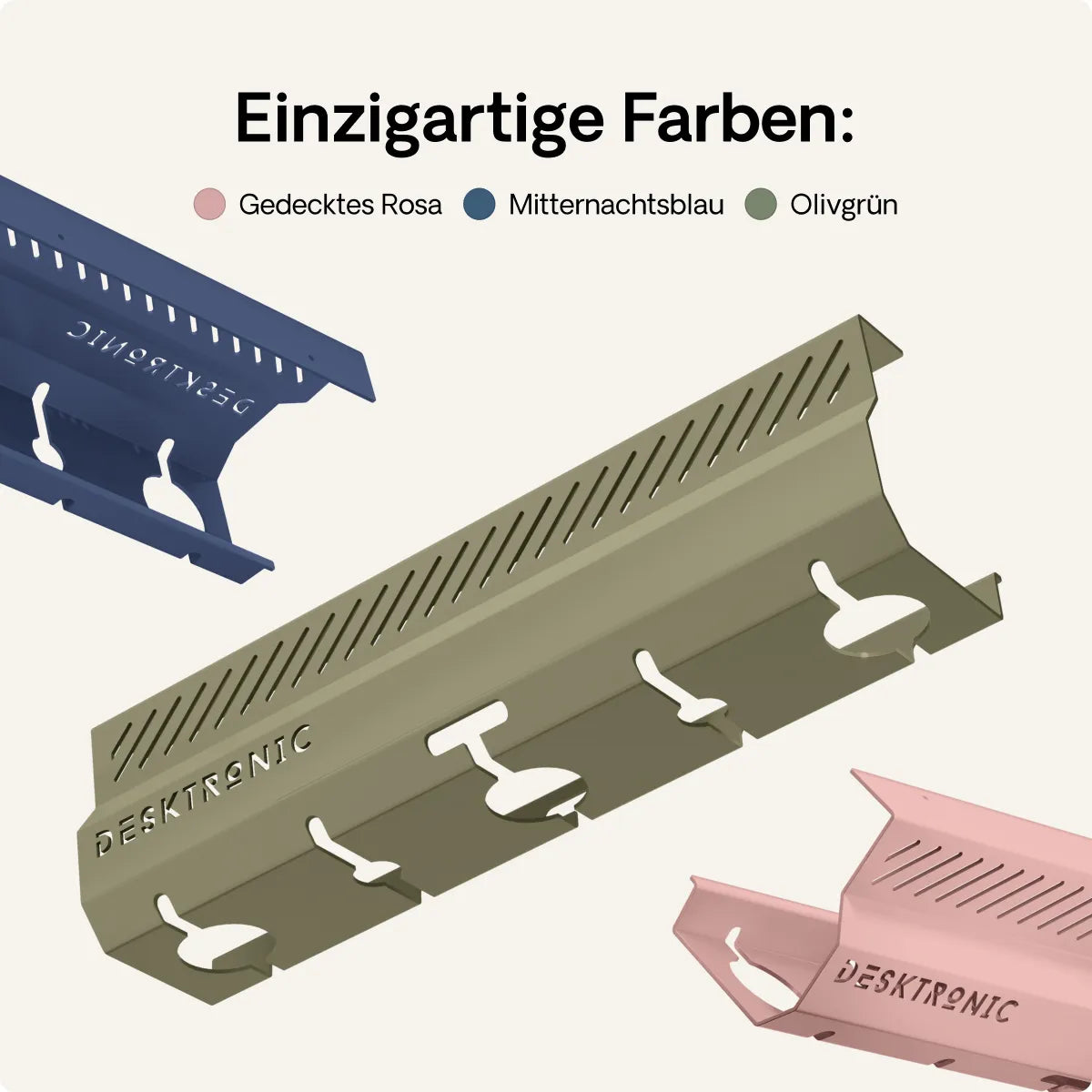 Kabelkanäle sind in denselben Farben erhältlich wie unsere Gestelle für höhenverstellbare Schreibtische, nämlich: Schwarz (RAL9005), Weiß (RAL9016) und Grau (RAL9006), um eine perfekte Farbübereinstimmung zu gewährleisten.