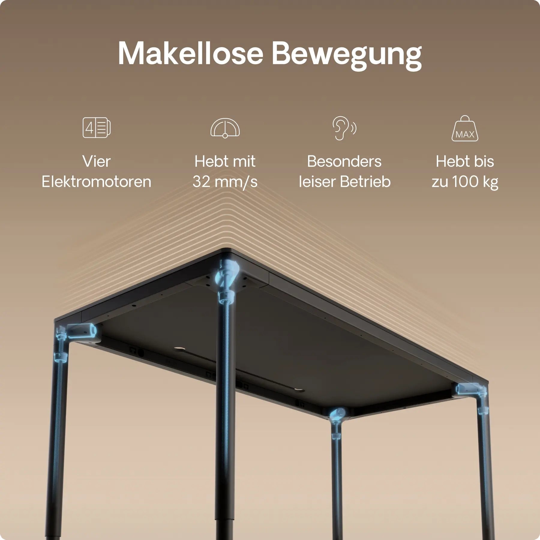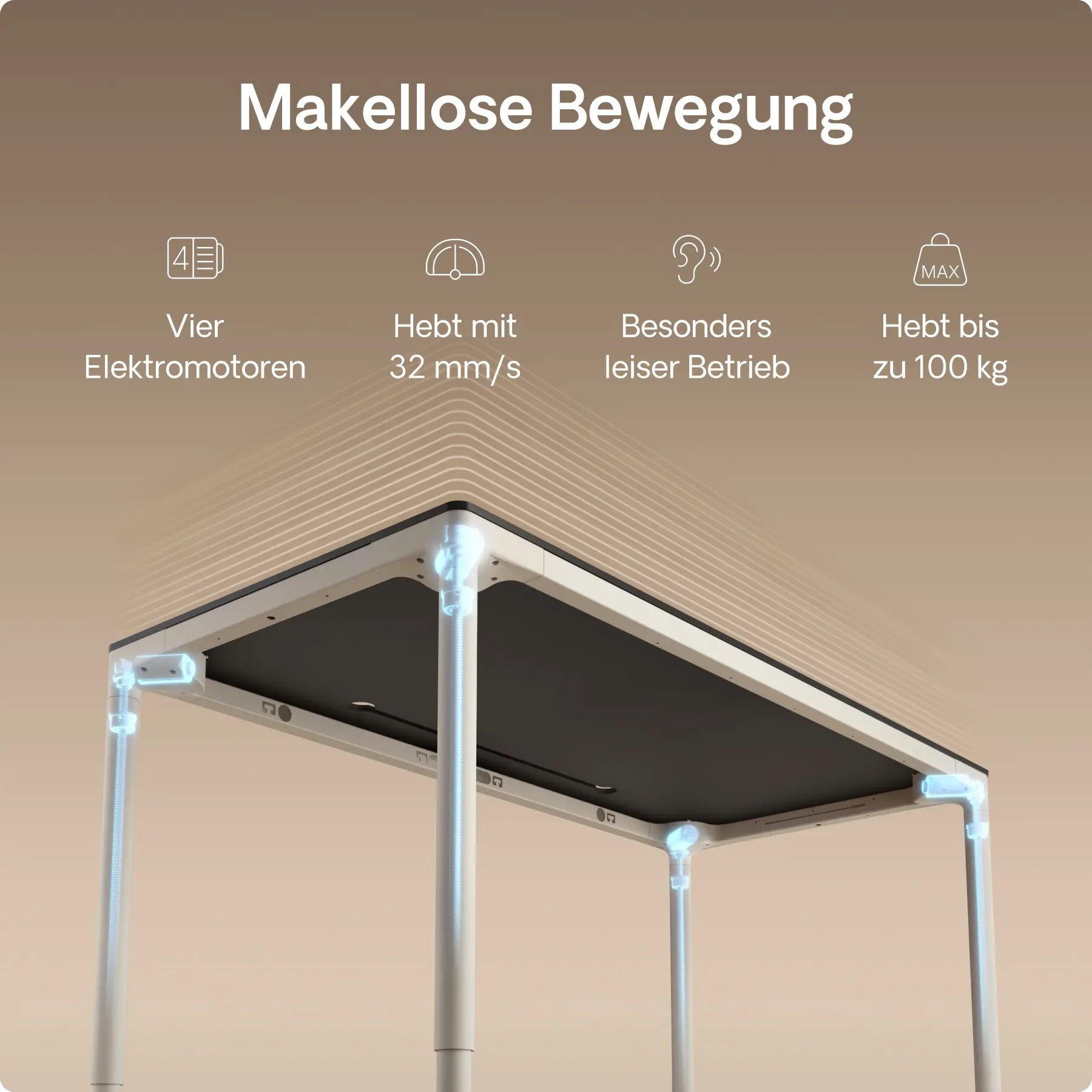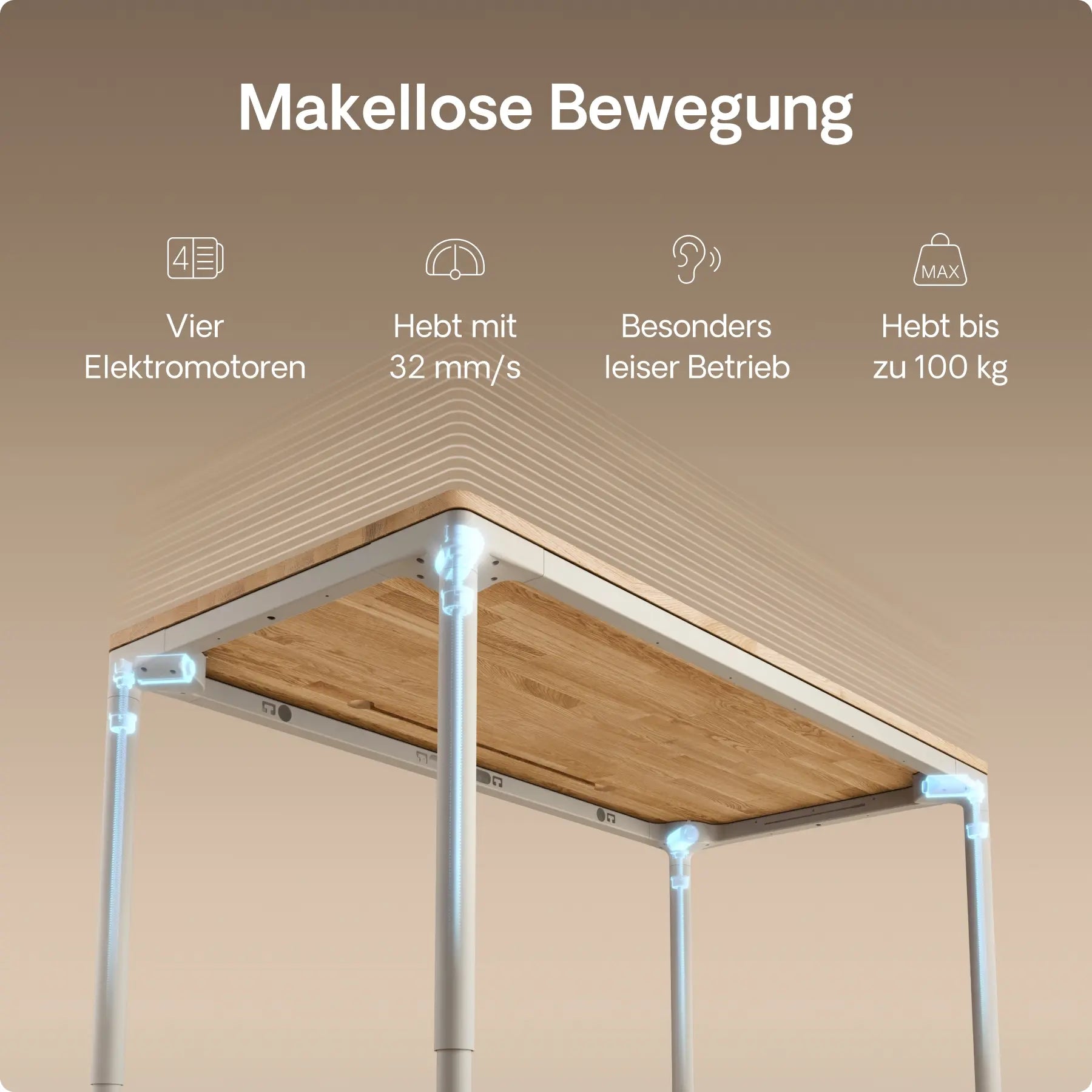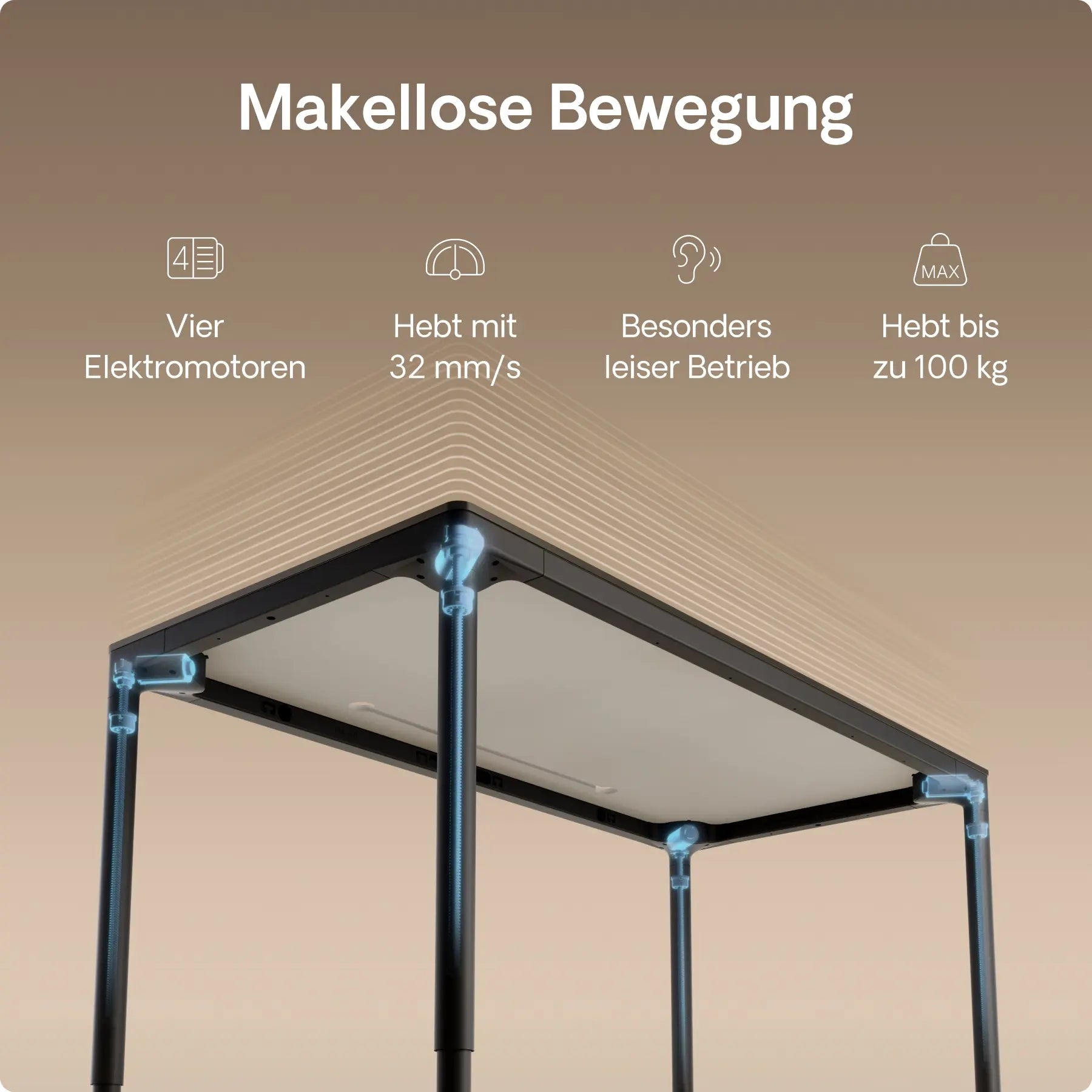 Vier präzise In-Line-Motoren, versteckt in jedem Bein, treiben diesen höhenverstellbaren Schreibtisch mit leiser Kraft und perfekter Synchronisation an – mit einer Geschwindigkeit von bis zu 30 mm/s. Doppelte Power. Mühelose Bewegung. Gebaut für die Ewigkeit.