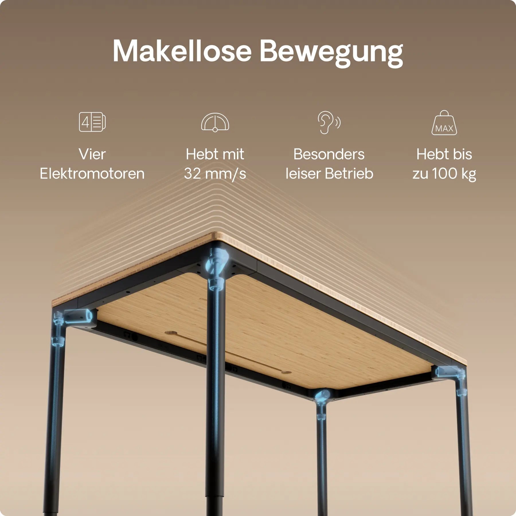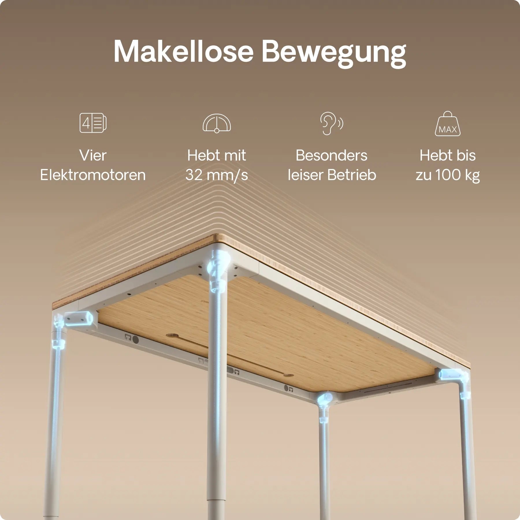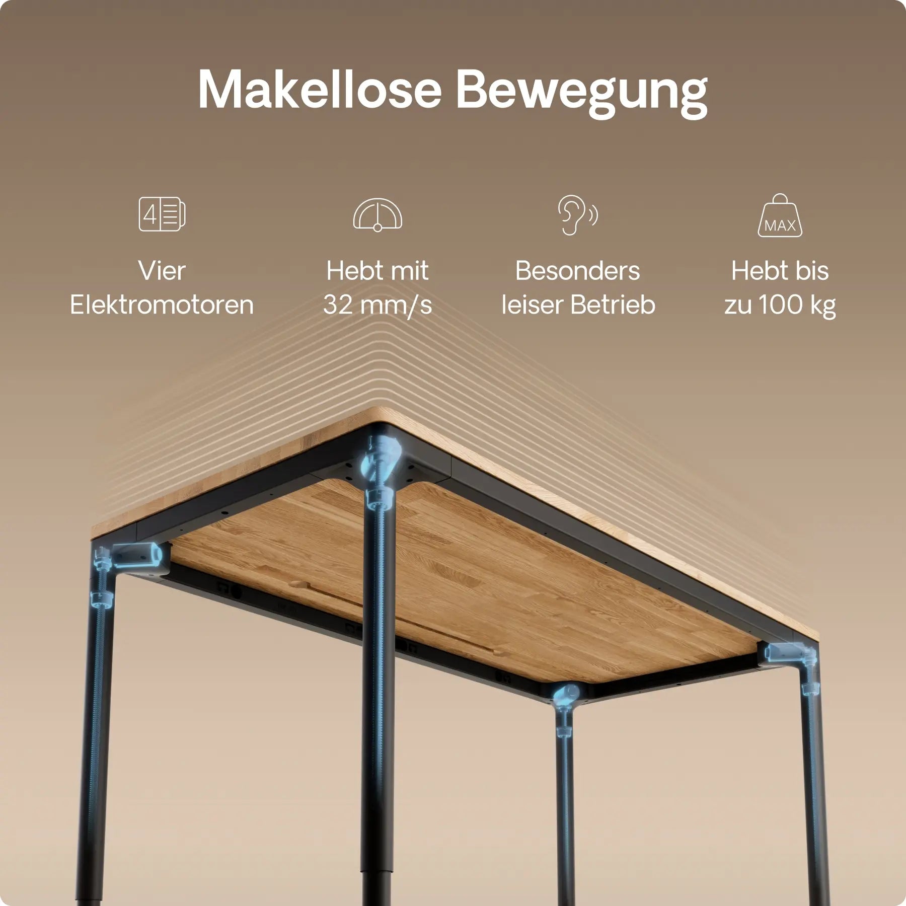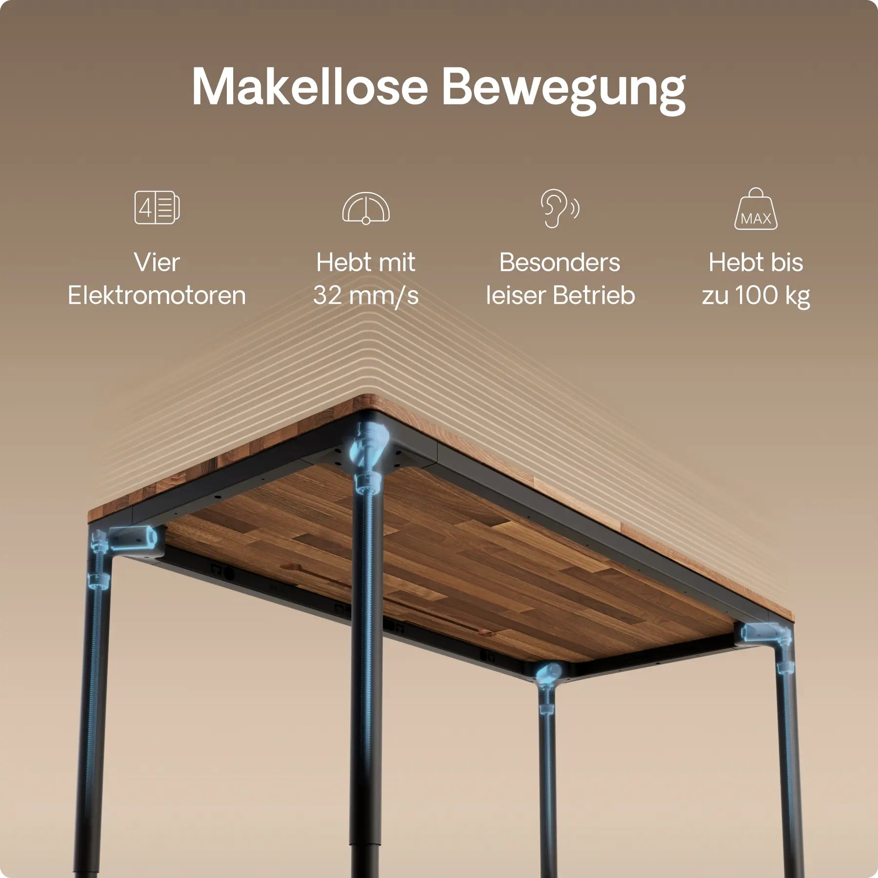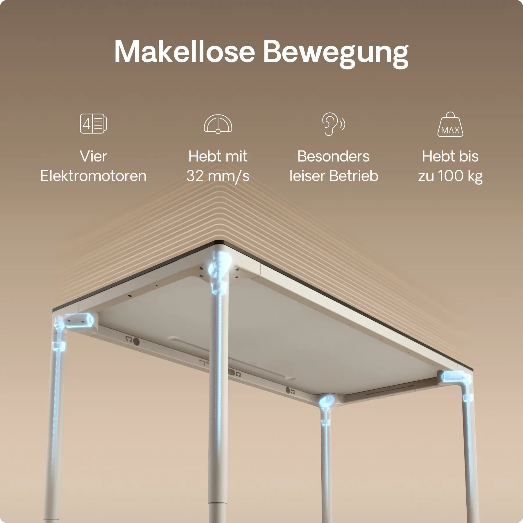 Vier präzise In-Line-Motoren, versteckt in jedem Bein, treiben diesen höhenverstellbaren Schreibtisch mit leiser Kraft und perfekter Synchronisation an – mit einer Geschwindigkeit von bis zu 30 mm/s. Doppelte Power. Mühelose Bewegung. Gebaut für die Ewigkeit.