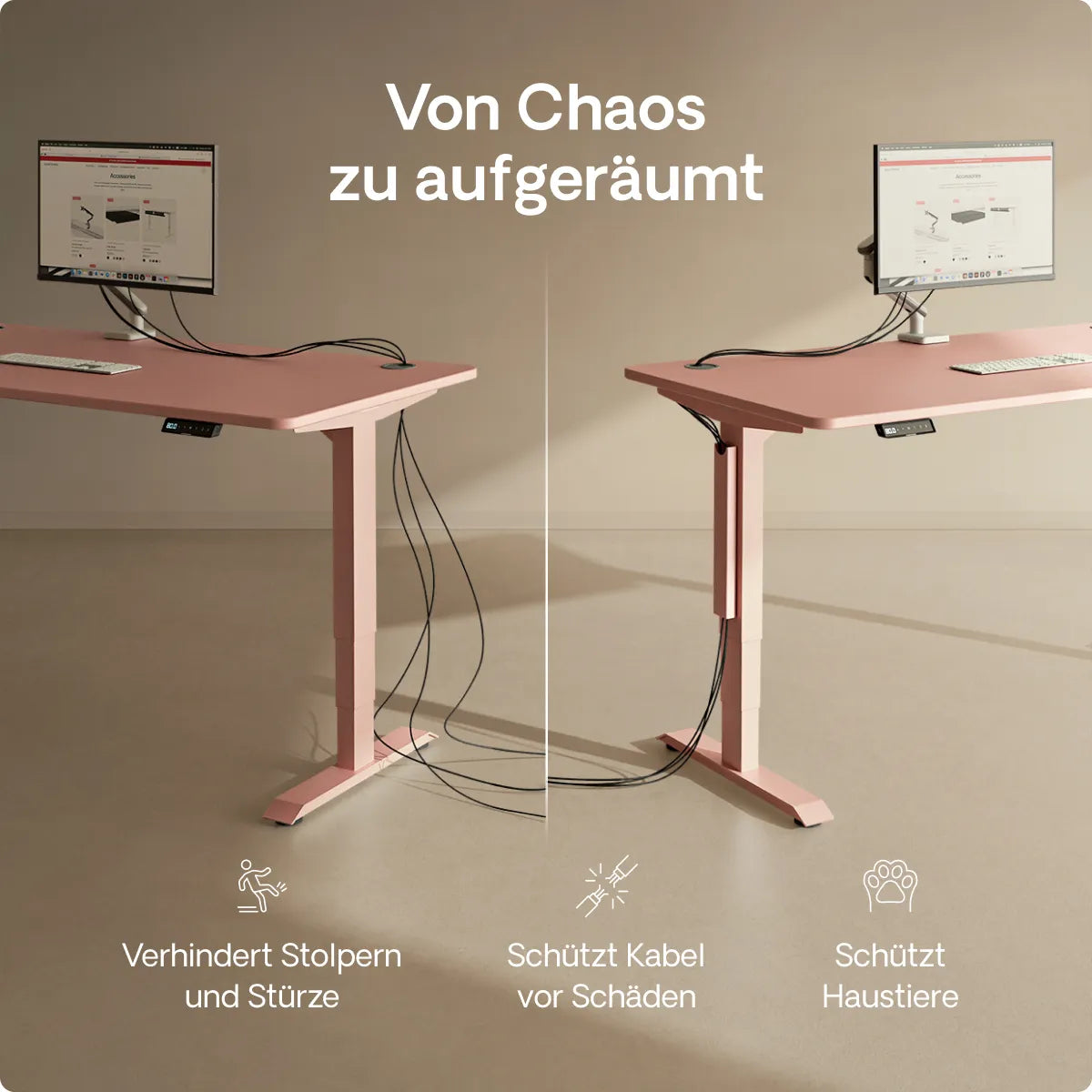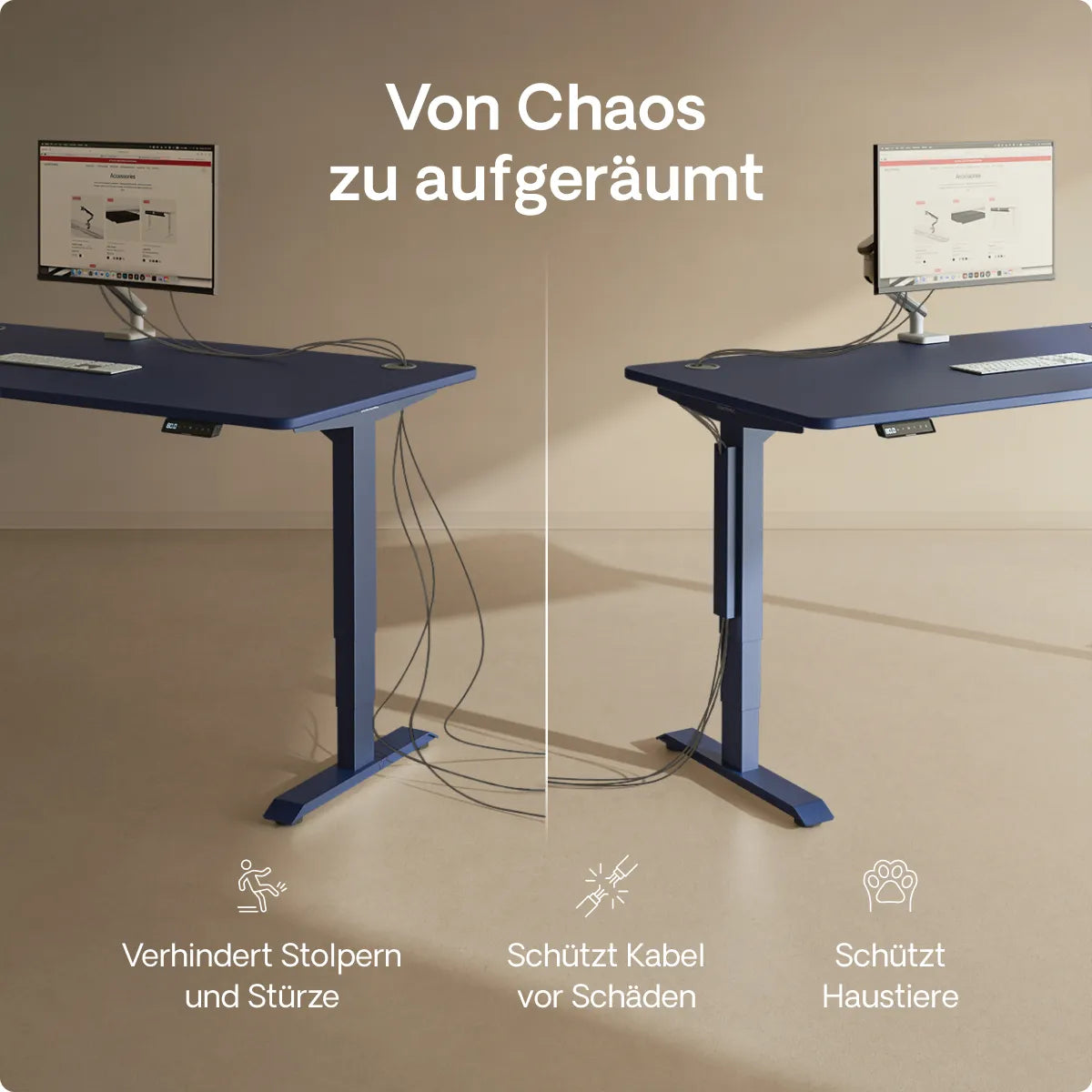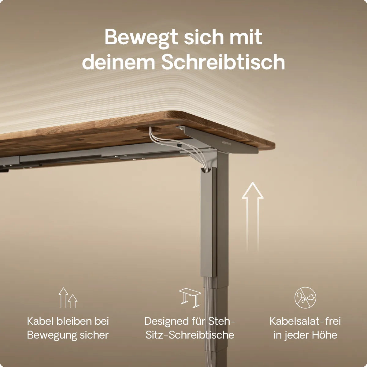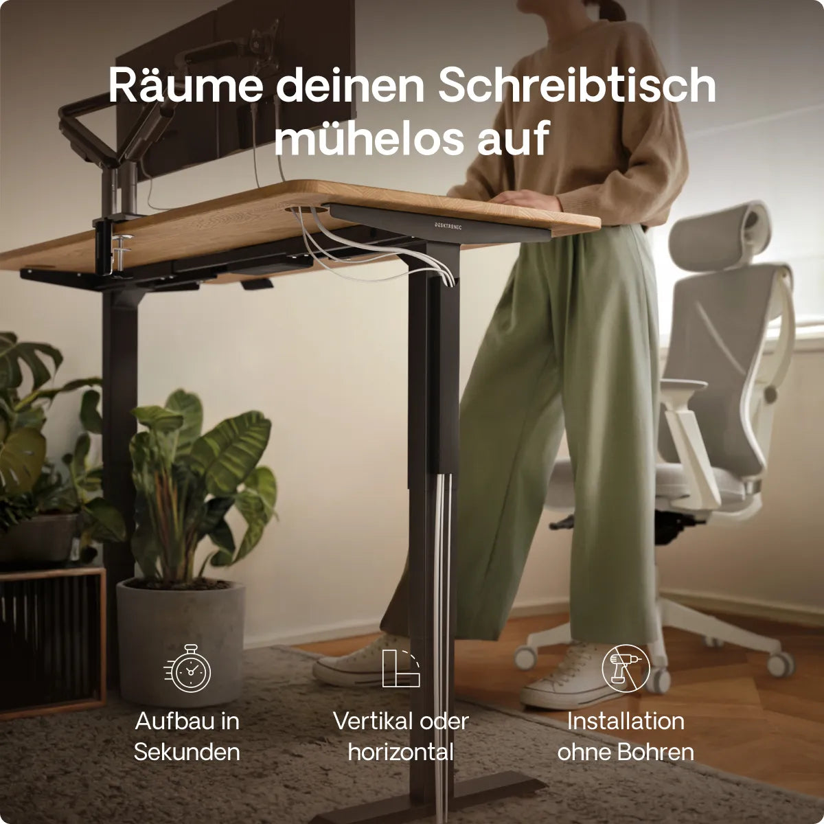 Die höhenverstellbaren Schreibtische von Desktronic bieten bequeme Einstellungsmöglichkeiten. Ausgestattet mit einem elektronischen Touchscreen-Controller, der die Höhe in Zentimetern anzeigt, ermöglichen diese Schreibtische ein müheloses Anheben oder Absenken mithilfe eines eingebauten Motors. Zusätzlich verfügen sie über drei vollständig programmierbare Höhenvoreinstellungen. Dadurch erreichst du deine bevorzugte Schreibtischposition mit nur einer Berührung.