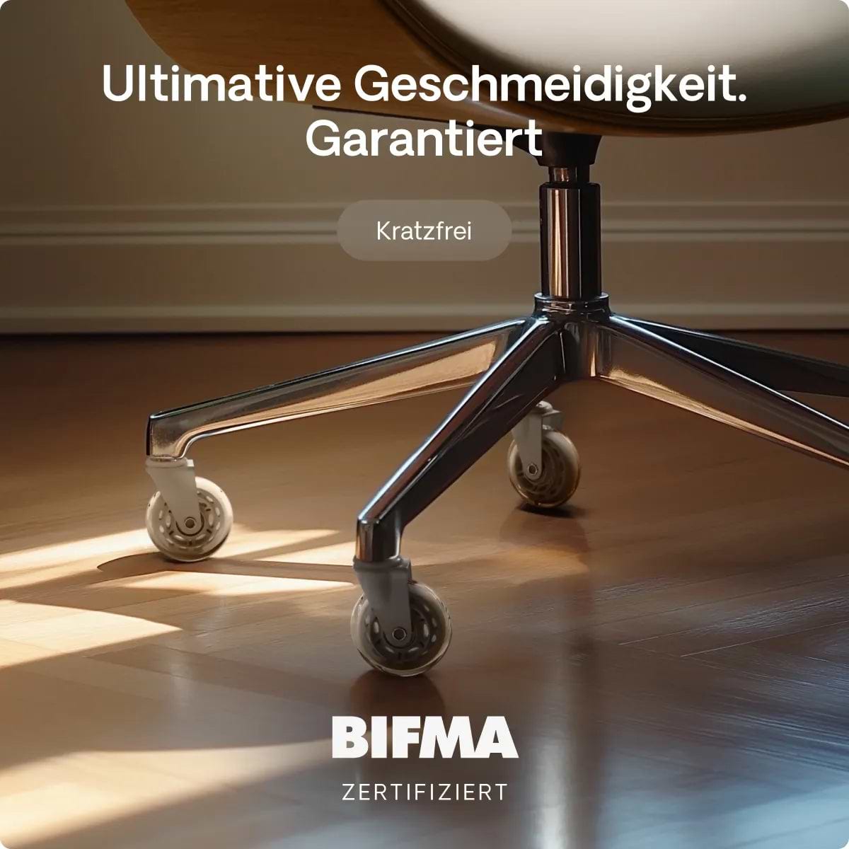 Zeit, sich von deiner Stuhlmatte zu trennen! Unsere Lenkrollen sind so konstruiert, dass sie auf allen Oberflächen reibungslos rollen - ob bei Hartholz, Teppich, Fliesen oder anderen Bodenbelägen. Sie sind völlig kratzfrei, damit du Geld sparst und deinen Boden schonst. Eine Win-Win-Situation.