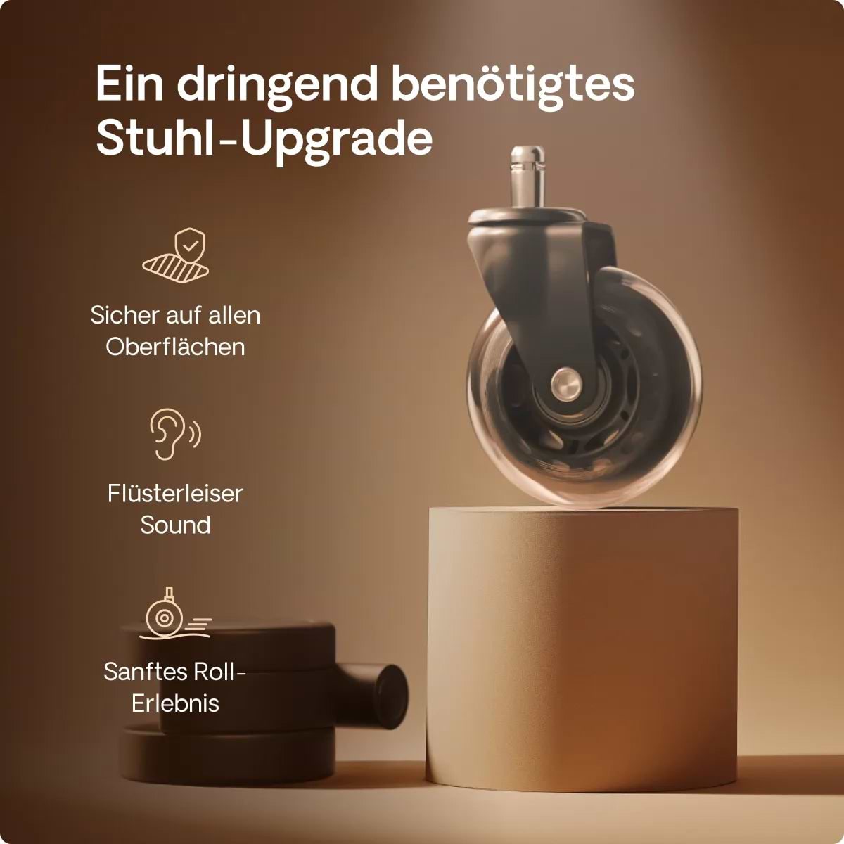 Die Gewichtskapazität zu übersehen ist ein Anfängerfehler. Dank unserer hochbelastbaren Stuhlräder musst du dir darüber jedoch keine Gedanken machen. Sie bieten eine Tragfähigkeit von bis zu 250 kg und sorgen für ein dynamisches Rollen ohne Brüche.
