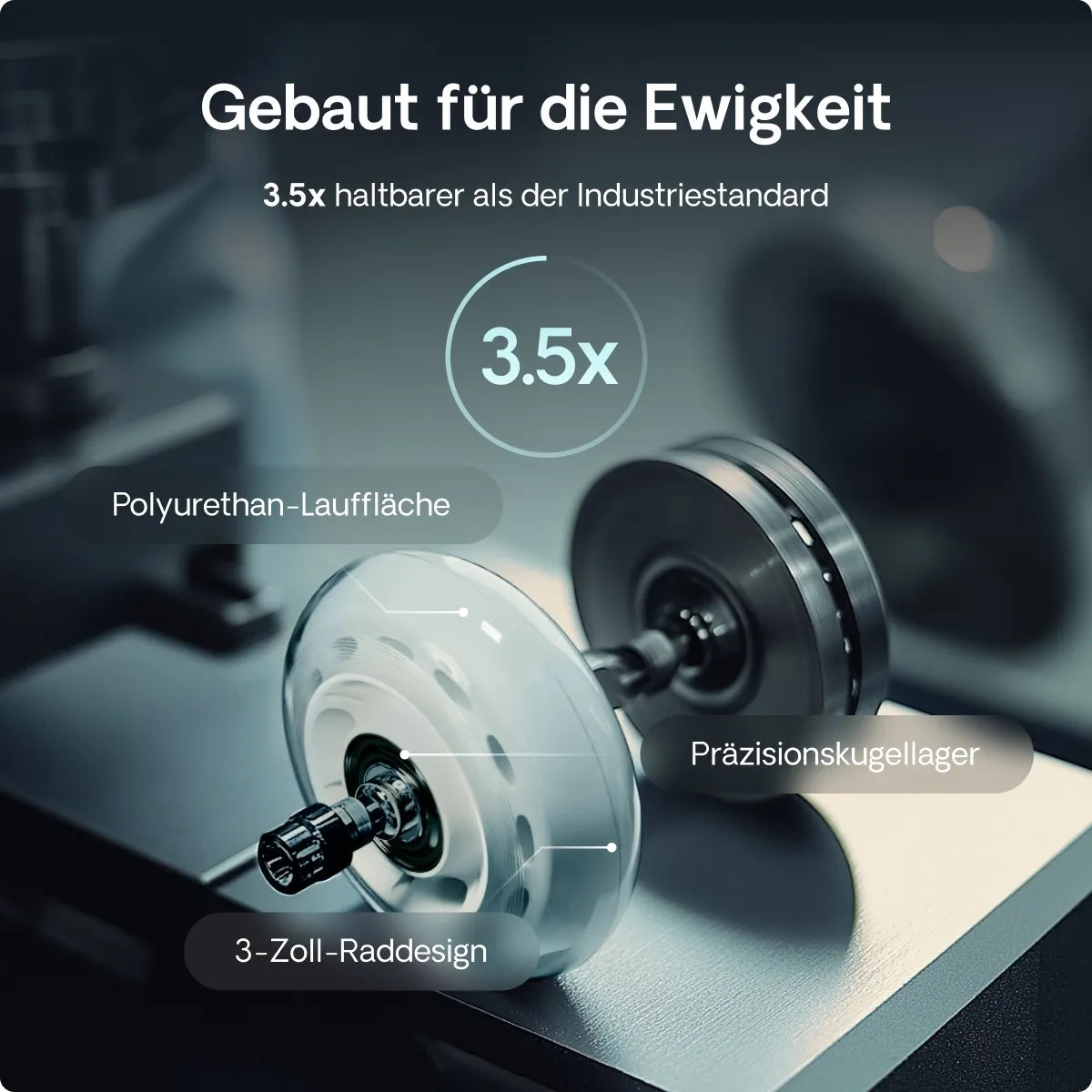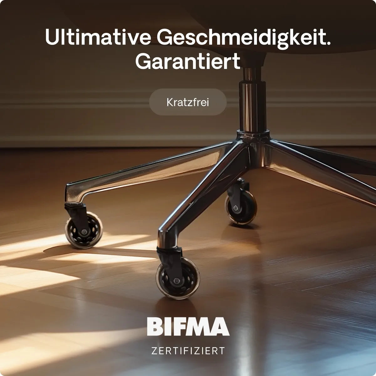 Die Gewichtskapazität zu übersehen ist ein Anfängerfehler. Dank unserer hochbelastbaren Stuhlräder musst du dir darüber jedoch keine Gedanken machen. Sie bieten eine Tragfähigkeit von bis zu 250 kg und sorgen für ein dynamisches Rollen ohne Brüche.