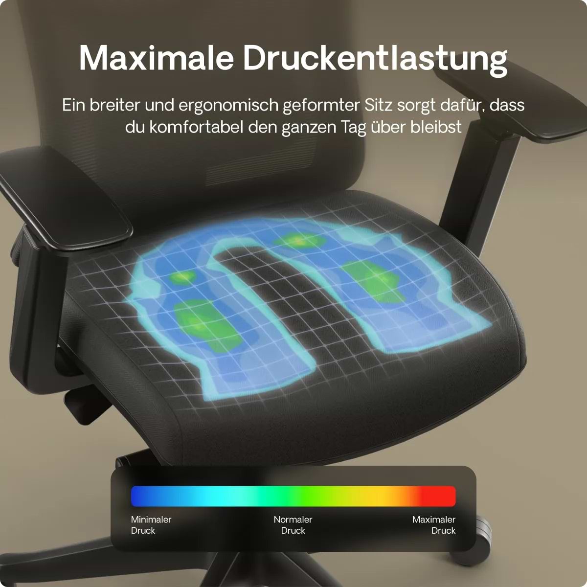 Der breite Sitz ist geformt, um dich zu unterstützen. Er verteilt den Druck gleichmäßig, um Belastungen zu reduzieren. Du wirst den Unterschied bei längeren Schreibtisch-Sessions bemerken und dich unterstützt und komfortabel fühlen.