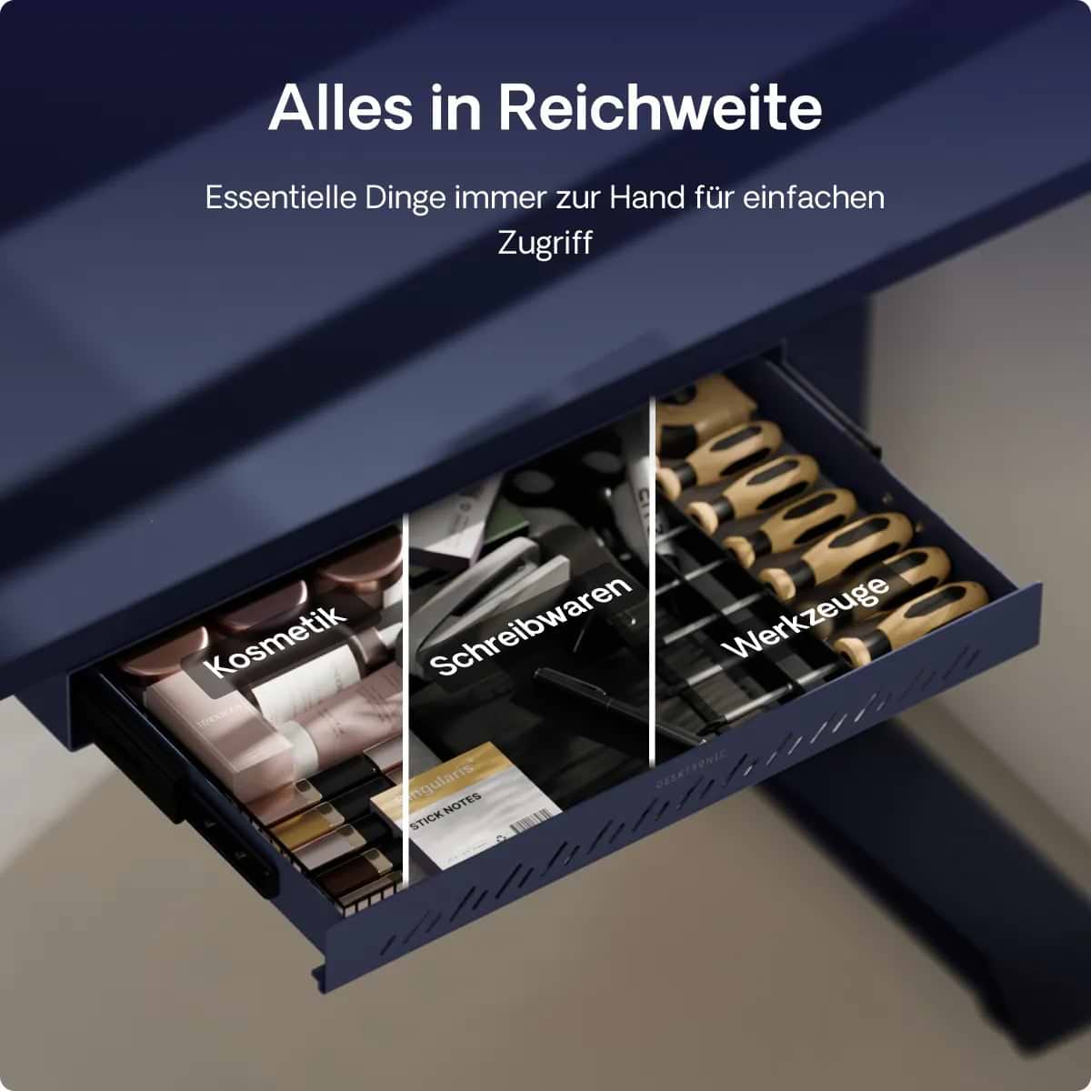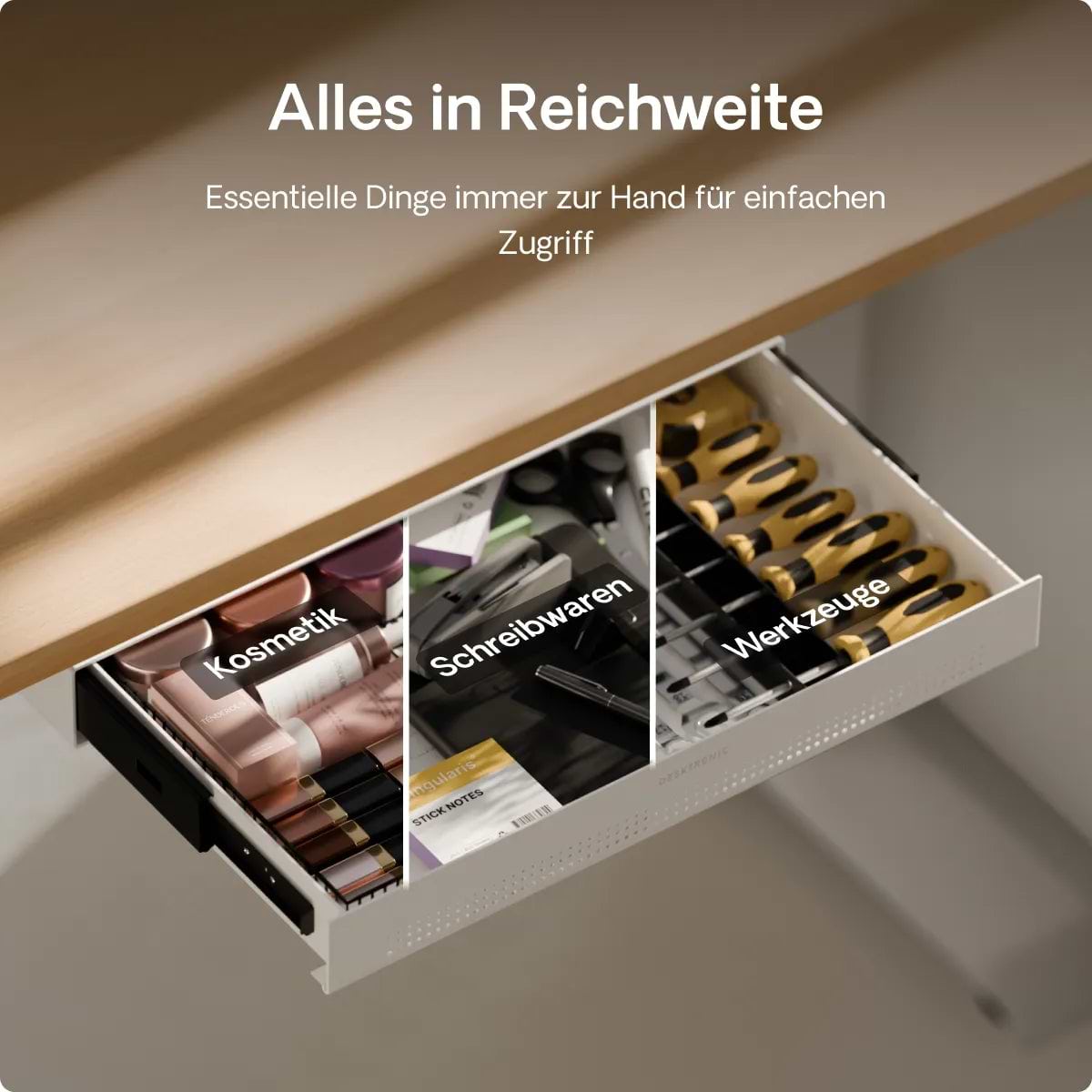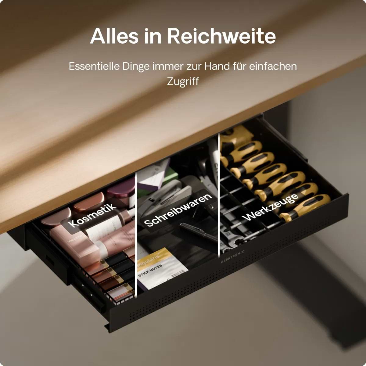 Die Schreibtischschublade wird für ihr schlankes Profil, ihre solide Metallkonstruktion und ihre sanften Schienen gelobt, die sich jedes Mal geräuschlos öffnen. Käufer schätzen den Platz, den sie f...